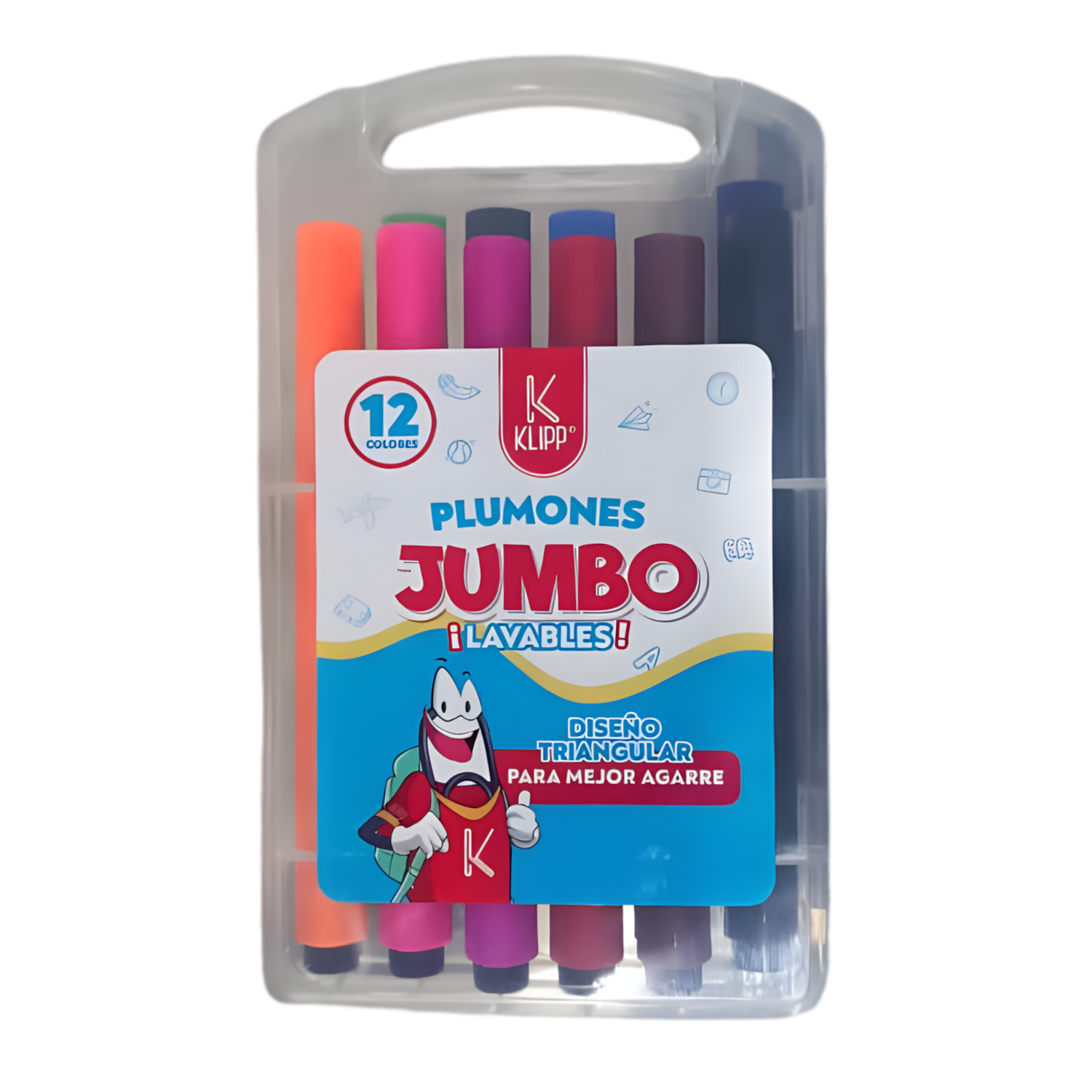 Plumón lavable jumbo, con trazo grueso y colores vivos, ideal para niños y actividades escolares. Su tinta lavable se elimina fácilmente de manos y ropa. Presentación en estuche por 12 unidades, perfecto para uso educativo y creativo. 🎨✨