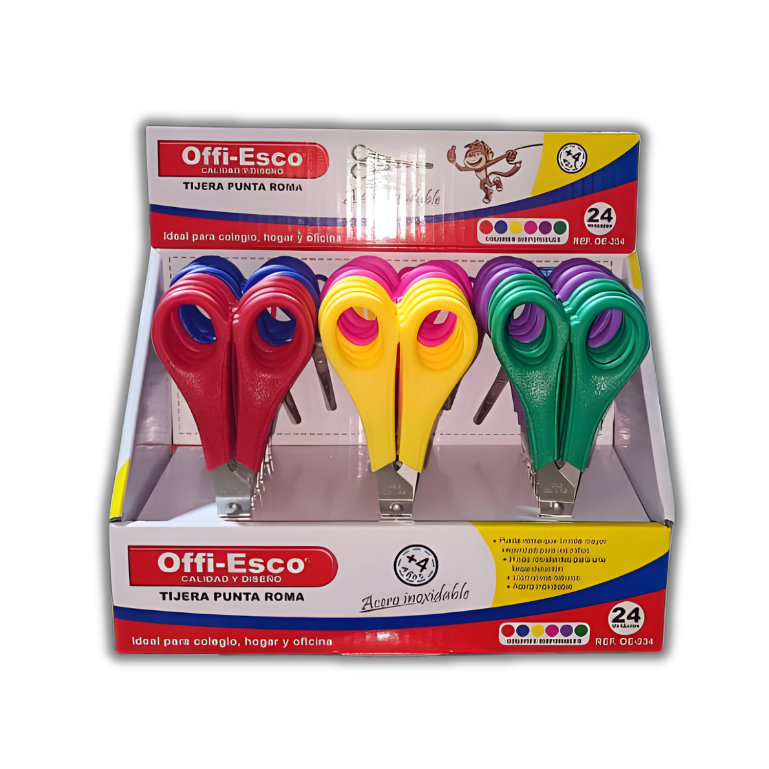 Tijera escolar con punta roma, diseñada para mayor seguridad. Corte preciso y cómodo, ideal para niños, manualidades y uso escolar diario. ✂️📘